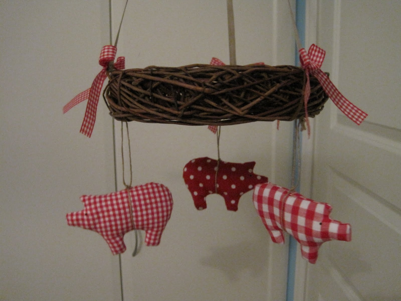 Ompelin lisää pikkupossuja, ja keksin laittaa ne roikkumaan kranssista välissä näin päin. Tein possuista myös vähän pulleampia kuin aikaisemmin.